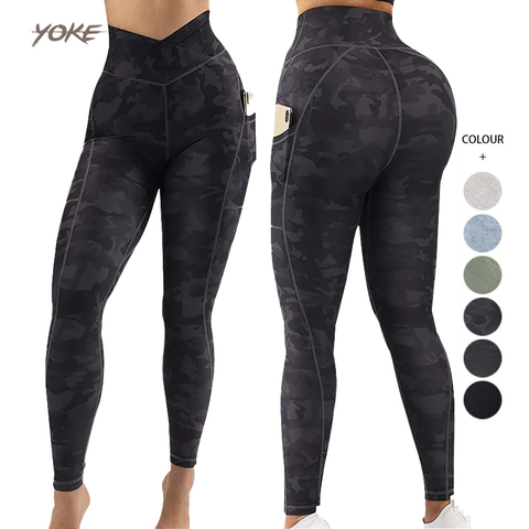 Ropa deportiva con logotipo personalizado, mallas deportivas ajustadas para Yoga, mallas de gimnasio con estampado de camuflaje y cintura cortada en forma de V con bolsillos laterales para mujer